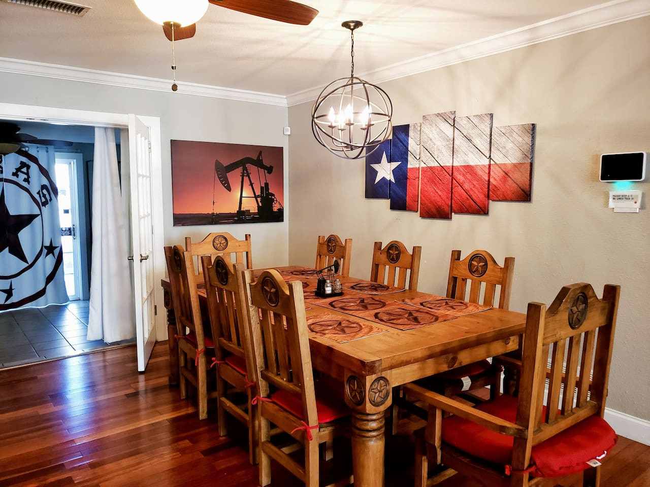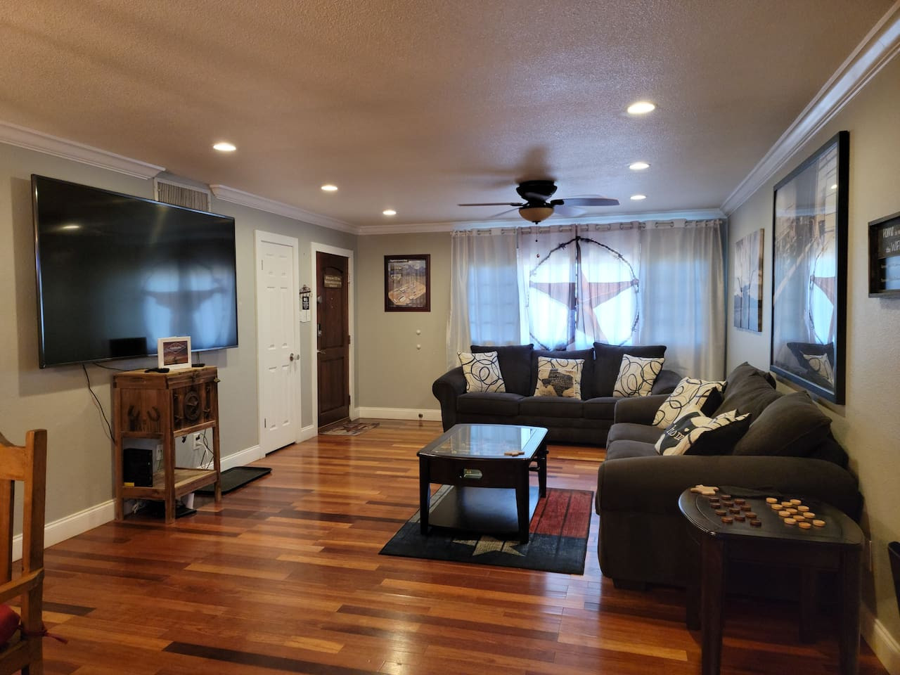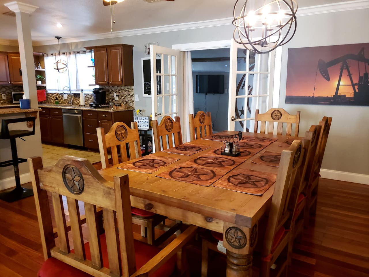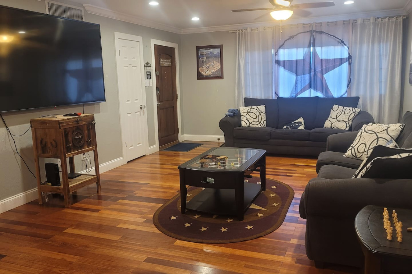 / nightLarge spacious living room and kitchen area with a texas appeal , great for large families or small , QUIET NEIGHBORHOOD, FAMILY FRIENDLY room for outdoor seating and activities No pets allowed House has been recently updated with brand new appliances throughout home, Stove, refrigerator, A/C unit & heater washer/dryer ,Tvs. furniture is brand new. since oct.2019. NO ANIMALS ALLOWED HOME IS CLEANED CLEANING SERVICE. TO HELP PREVENT THE SPREAD OF ANY VIRUS AFTER EACH CHECKOUT. Large spacious living room and kitchen area with a texas appeal , great for large families or small , QUIET NEIGHBORHOOD, FAMILY FRIENDLY room for outdoor seating and activities as well. No ANIMALS allowed NOTE: HOME IS CLEANED BY A PROFESSIONAL CLEANING SERVICE. TO HELP PREVENT THE SPREAD OF ANY VIRUS AFTER EACH CHECKOUT. EVERYONES HEALTH AND WELLBEING IS IMPORTANT RIGHT NOW INCLUDING MY OWN FAMILY AND YOURS. sanitizer is provided for guest use, as well as disfected wipes to use as needed. entire home, attached garage not for parking, laundry room only, but back garage/storage unit can be used for additional parking, can hold at least 1 vechile, has a roll up garage door, access is through the back yard, can also use for entertainment if needed. NO ANIMALS ALLOWED back storage unit has electricity, plug in outlets, overhead lights , good very entertaining available to answer any questions or concerns via Airbnb message, my cell phone via text or call, I will respond asap, always have my phone with me. NO ANIMALS ALLOWED QUIET FAMILY FRIENDLY NEIGHBORHOOD. house is centered in middle of town, in a quiet neighborhood, less than 2 miles from major restaurants, shopping mall & grocery store uber & Lyft is available FYI; FOR GUESTS OF 2 OR LESS I DO PROVIDE A LOWER NIGHTLY RATE ,PLEASE ASK We of course want you to be as comfortable as possible, so if there is anything that is needed for your stay, let me know. We ask with the respect of our neighbors who consent to us having an Airbnb, to please be respectful of their space( dont park in front of their homes) keep voices down, no yelling in front yard, keep interaction/ activities in backyard as much as possible. NO ANIMALS ALLOWED
