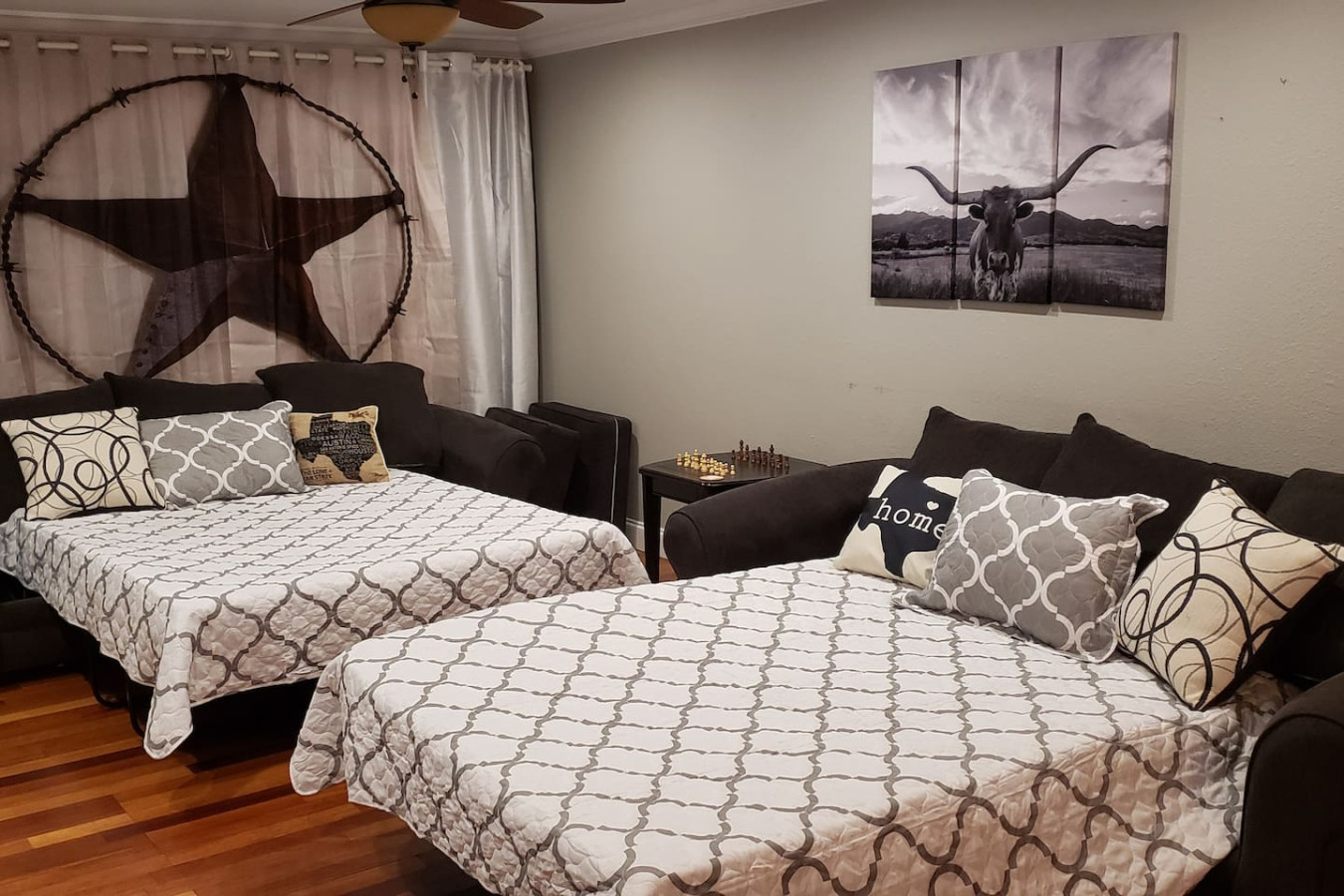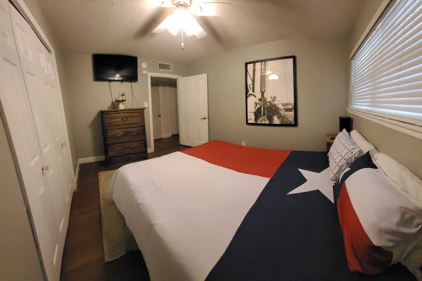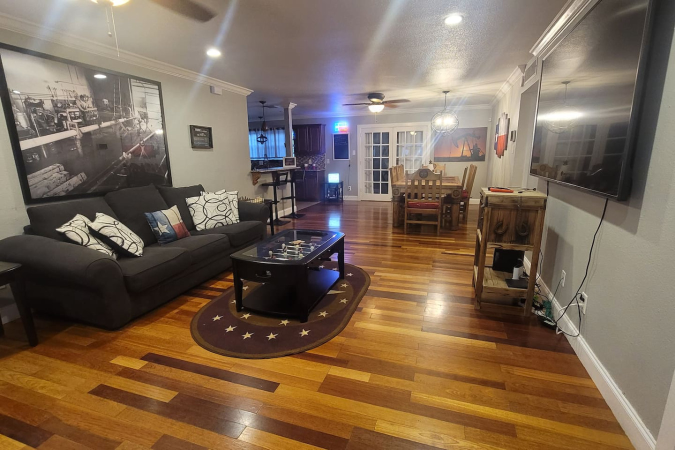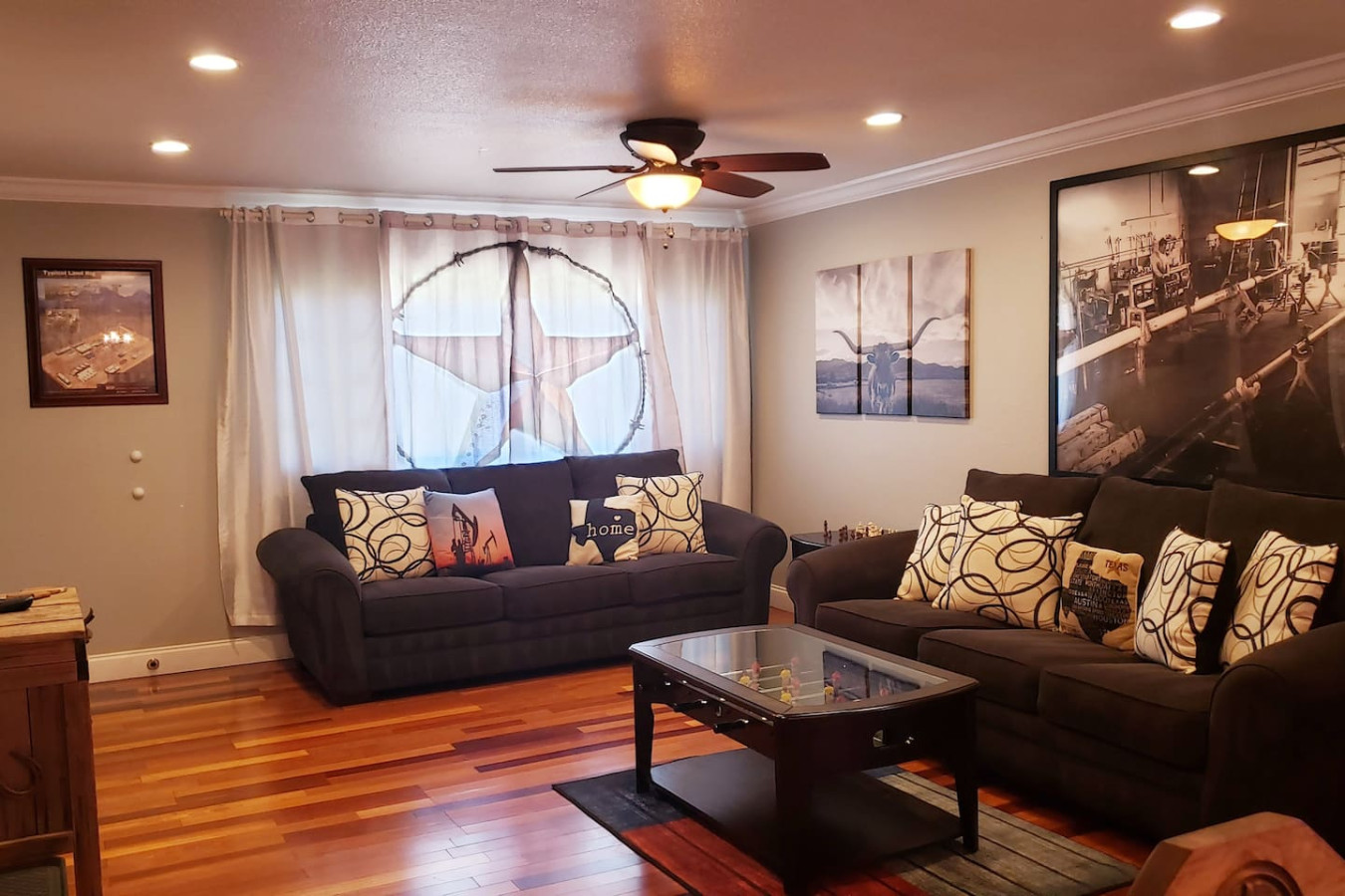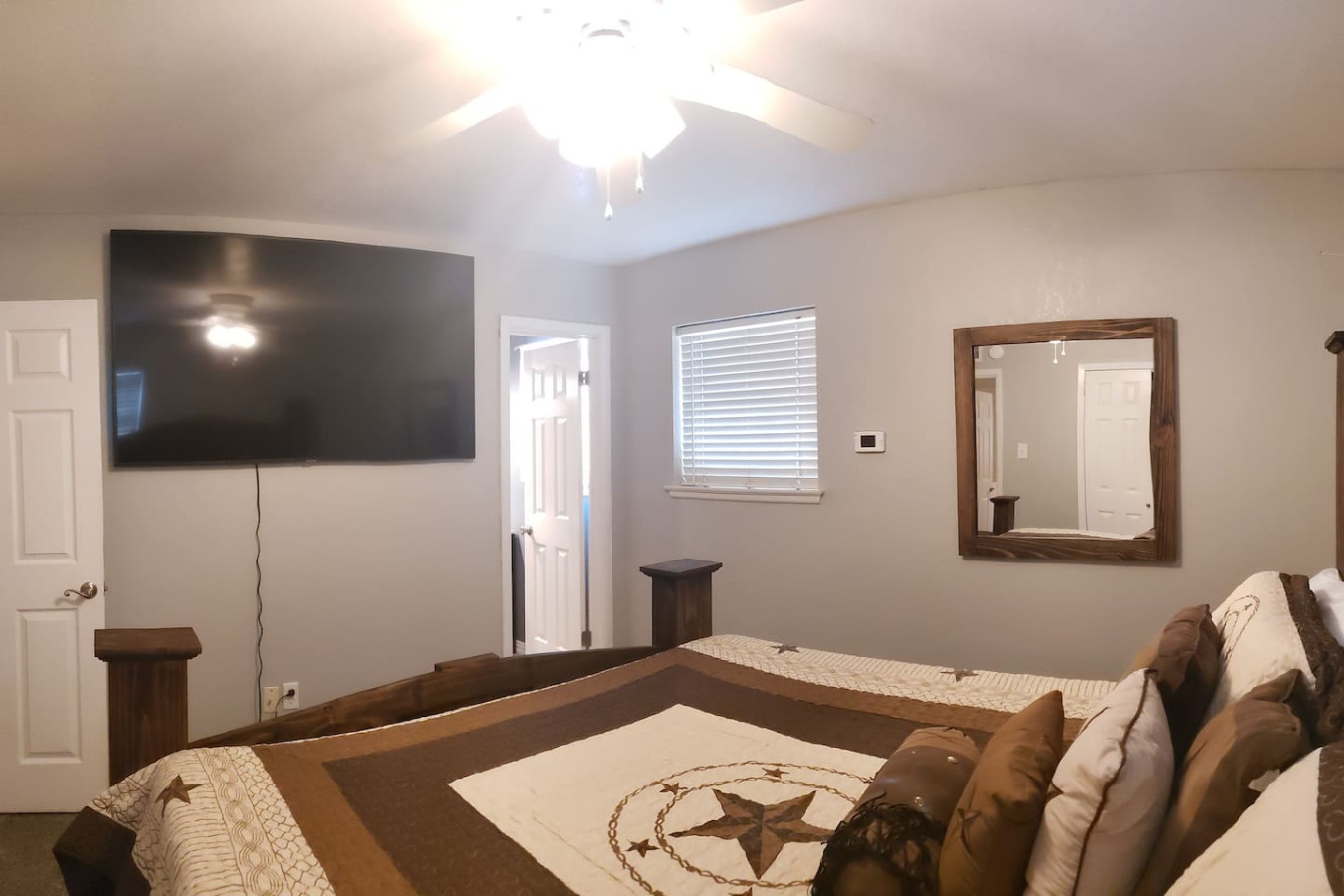/ nightLarge spacious living room and kitchen area with a texas appeal , great for large families or small , QUIET NEIGHBORHOOD, FAMILY FRIENDLY room for outdoor seating and activities No pets allowed House has been recently updated with brand new appliances throughout home, Stove, refrigerator, A/C unit & heater washer/dryer ,Tvs. furniture is brand new. since oct.2019. NO ANIMALS ALLOWED HOME IS CLEANED CLEANING SERVICE. TO HELP PREVENT THE SPREAD OF ANY VIRUS AFTER EACH CHECKOUT. Large spacious living room and kitchen area with a texas appeal , great for large families or small , QUIET NEIGHBORHOOD, FAMILY FRIENDLY room for outdoor seating and activities as well. No ANIMALS allowed NOTE: HOME IS CLEANED BY A PROFESSIONAL CLEANING SERVICE. TO HELP PREVENT THE SPREAD OF ANY VIRUS AFTER EACH CHECKOUT. EVERYONES HEALTH AND WELLBEING IS IMPORTANT RIGHT NOW INCLUDING MY OWN FAMILY AND YOURS. sanitizer is provided for guest use, as well as disfected wipes to use as needed. entire home, attached garage not for parking, laundry room only, but back garage/storage unit can be used for additional parking, can hold at least 1 vechile, has a roll up garage door, access is through the back yard, can also use for entertainment if needed. NO ANIMALS ALLOWED back storage unit has electricity, plug in outlets, overhead lights , good very entertaining available to answer any questions or concerns via Airbnb message, my cell phone via text or call, I will respond asap, always have my phone with me. NO ANIMALS ALLOWED QUIET FAMILY FRIENDLY NEIGHBORHOOD. house is centered in middle of town, in a quiet neighborhood, less than 2 miles from major restaurants, shopping mall & grocery store uber & Lyft is available FYI; FOR GUESTS OF 2 OR LESS I DO PROVIDE A LOWER NIGHTLY RATE ,PLEASE ASK We of course want you to be as comfortable as possible, so if there is anything that is needed for your stay, let me know. We ask with the respect of our neighbors who consent to us having an Airbnb, to please be respectful of their space( dont park in front of their homes) keep voices down, no yelling in front yard, keep interaction/ activities in backyard as much as possible. NO ANIMALS ALLOWED